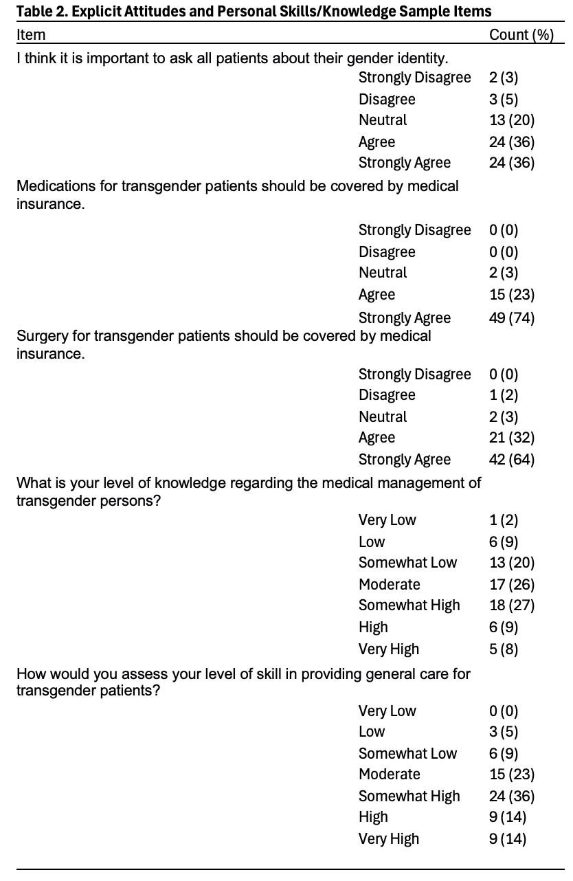 p = 0.04). No significant relationships were found between D-score and other physician traits. Explicit self-reported bias was unrelated to physician characteristics. Self-reported transgender care knowledge and skills varied more than attitudes. Attitudes were largely positive (Table 2). Regression showed more experienced physicians felt more comfortable and knowledgeable in transgender healthcare.