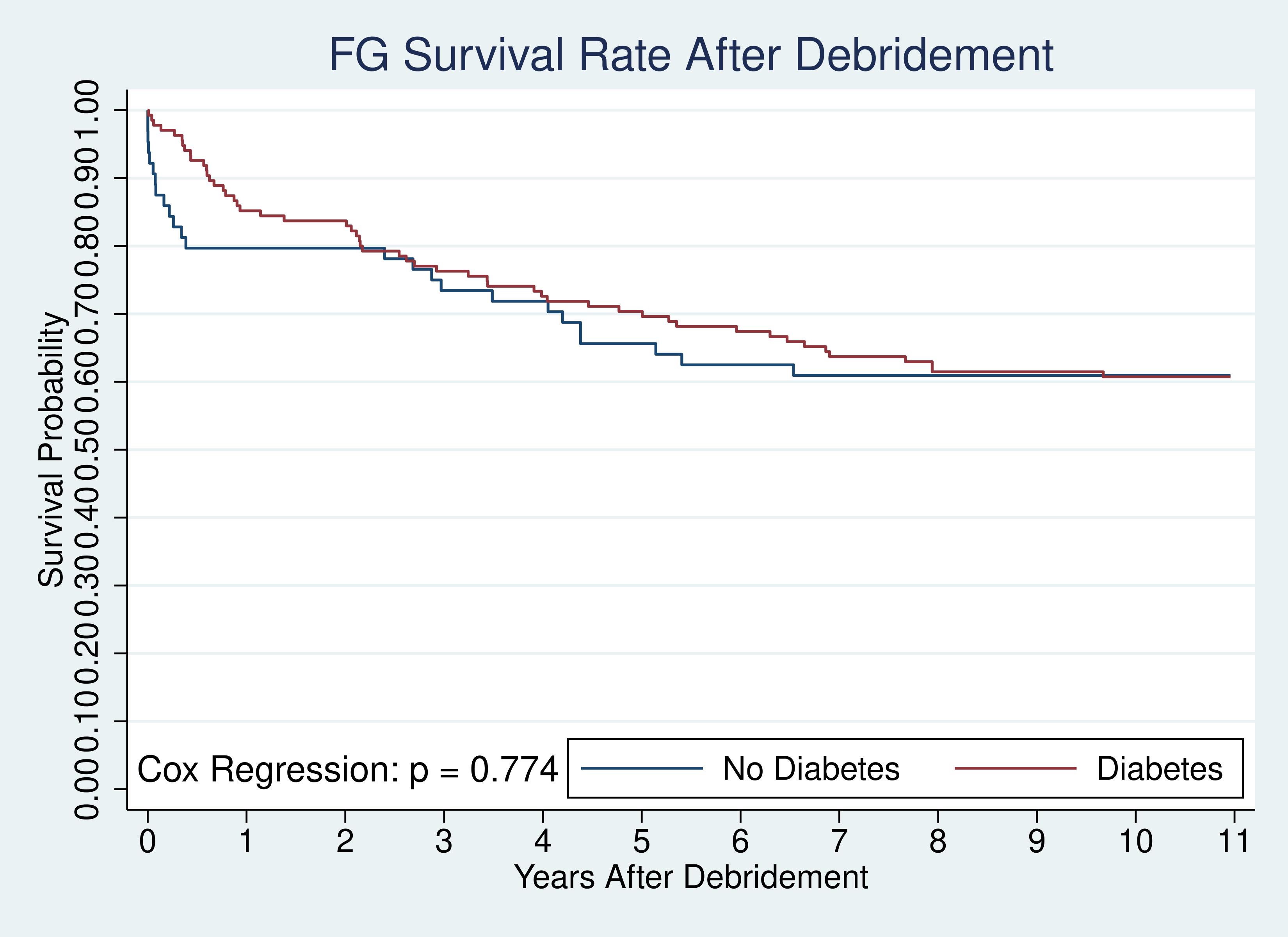 RESULTS: Among our 199 FG patient cohort (83% male, 81% white, median age 58 [IQR: 48, 66]), 135 (68%) patients were diabetic on admission, with 11 diagnosed on admission. 110 (55%) patients had available A1C on admission with an average A1C of 8.5. Diabetic patients had higher median Body Mass Index (33.95 vs 30.5, p=.0089) and higher average Charles Comorbidity Index (CCI) points (2.92 vs 4.13, p=.0008) than non-diabetic patients. Over the entire study period, age (HR: 1.0245, p=.036) and CCI (HR: 1.1964, p=.001) were associated with post-debridement mortality while diabetic status had no effect. Within 6 months post-debridement, CCI (HR: 1.2580, p=.018) remained associated with mortality, but diabetes (HR: .3067, p=.013) was associated with lower mortality. Figure 1 shows Kaplan-Meier survival curves comparing diabetic and non-diabetic FG patients over the study period.
