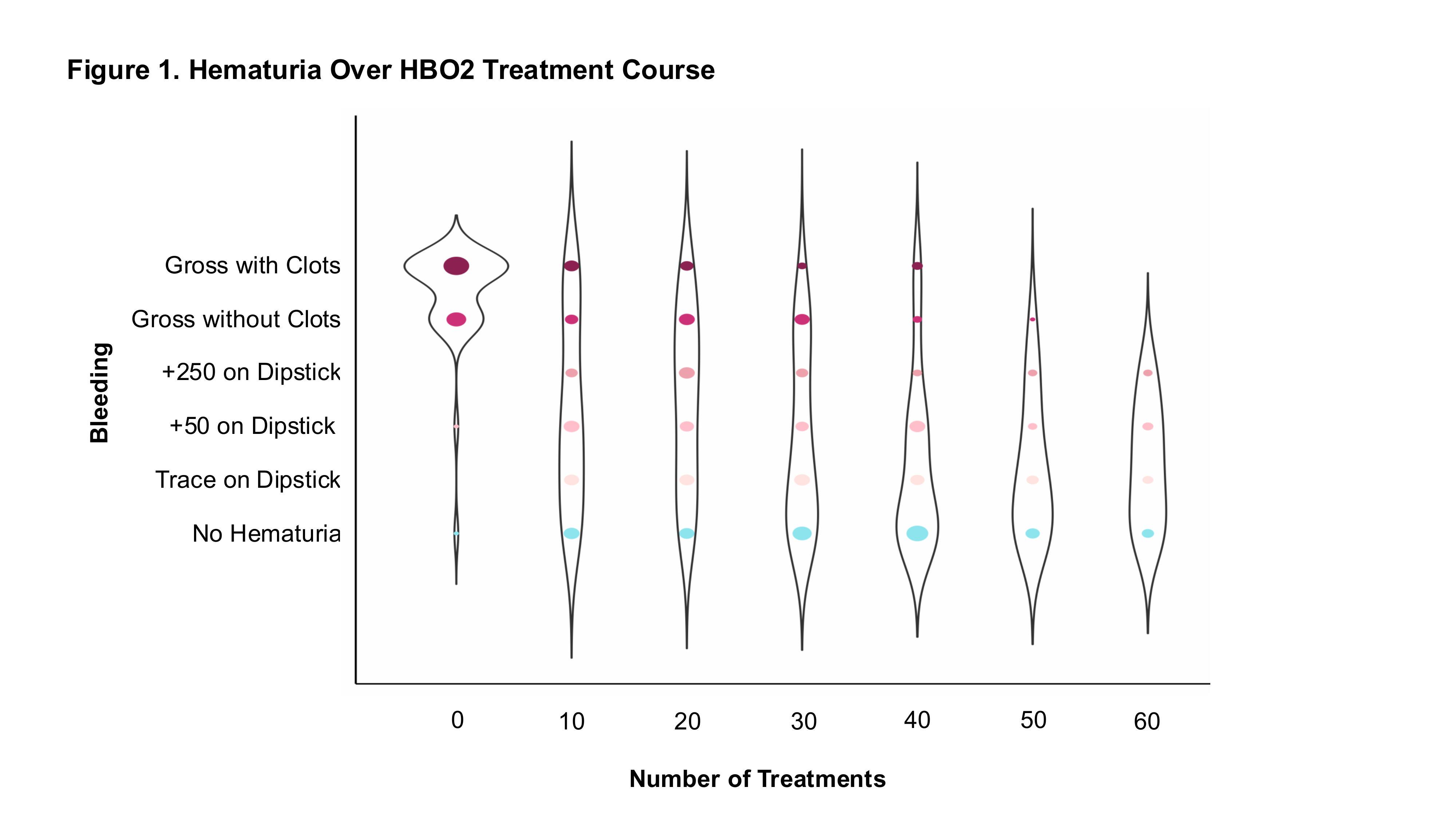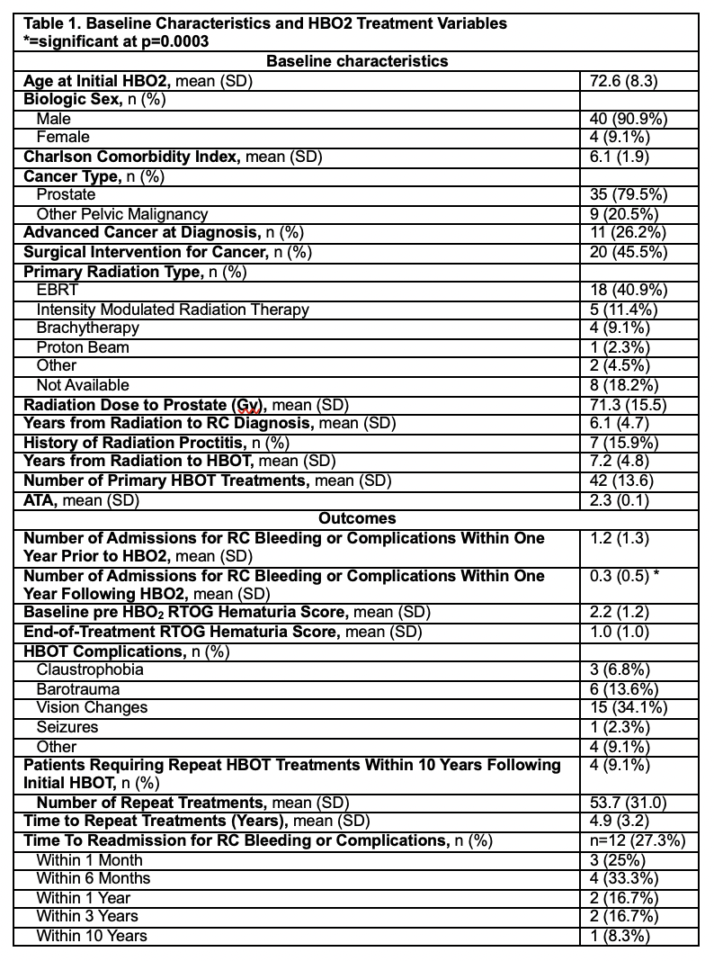 Table 1 reports baseline characteristics and HBO2 outcomes. Figure 1 shows the change in hematuria over HBO