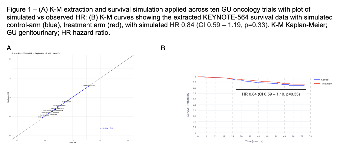 Results: Across 10GU-oncology trials, our methods accurately re-simulated survival estimates compared to observed date(Figure 1A). Within KEYNOTE-564, 54.5%(N = 123) of patients in the control-arm that experienced progression are not reported to have received CPI. We estimate 20-fewer deaths in the control-arm had all patients received dual-CPI upon progression; HR 0.84(CI0.59-1.19,p=0.33)(Figure 1B). On sensitivity analysis, an OS benefit in KEYNOTE-564 is only observed if dual-CPI survival benefit is applied to ≤45%(N=55/123) control-arm progressors.
