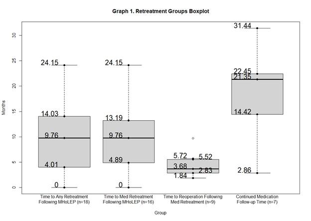 Results: Median follow-up was 26.5 months. Patients requiring continued medication retreatment at study end had a higher median comorbidity index (CCI) compared to the durable group (6 vs. 3, P=0.028). Reoperations occurred in 9.7% of cases, with necessary retreatment evident at a median of 9.8 months and average reoperation occurring 3.7 months later. Competing risks survival analysis identified CCI as a significant predictor of medication retreatment (HR: 1.76, P<0.001), but limited sample sizes precluded definitive conclusions. Two reoperation patients underwent direct reoperation without intermediate medication retreatment (5 days and 22.2 months post-op).