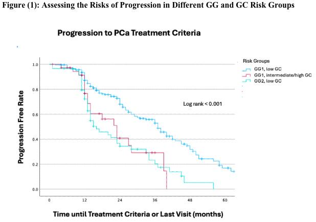 RESULTS: We identified 287 patients: 189 (47.1%) GG1/GC low, 38 (50%) GG1/GC intermediate/high, and 60 (26.7%) GG2/GC low. Overall, 176 (58.6%) met treatment criteria. Progression rates differed significantly among GG and GC groups (Figure 1). GG1/GC low patients progressed more slowly, reaching the treatment threshold at 36 months, while GG1/GC intermediate/high and GG2/GC low groups did so at 14 months. Cox regression showed GG1/GC intermediate/high (HR 2.15, p=0.004) and GG2/GC low (HR 2.56, p<0.001) were associated with higher odds of reaching treatment criteria relative to GG1/GC low when adjusting for PIRADS 4-5 (HR 1.42, p=0.253) and PSAD (HR 0.716, p=1.42).