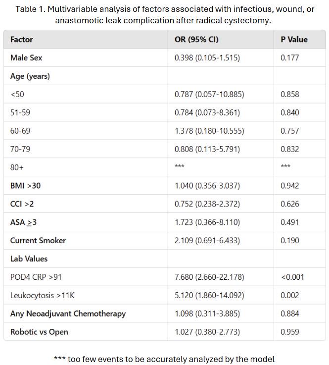 BACKGROUND: Radical cystectomy (RC) is a procedure with significant complications, including infections, wound complications, or anastomotic leaks (I/W/L). Identifying high-risk patients is crucial for morbidity reduction. C-reactive protein (CRP), a non-specific inflammatory marker, is often used postoperatively. We hypothesized that an elevated CRP on post-op day (POD) 4 could signal an increased risk of I/W/L complications.