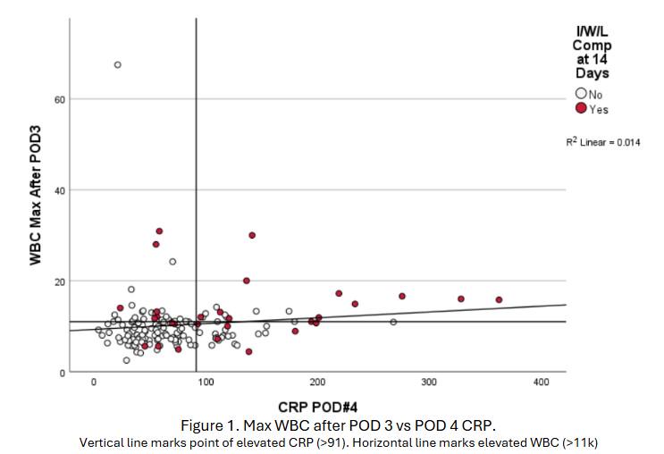 RESULTS: No significant demographic differences between groups were found (Table 1). CRP was strongly predictive (AUC = 0.762), with a calculated cutoff of 91. CRP >91 (OR 7.68, 95% CI 2.6-22.18, p<0.001) and leukocytosis (OR 5.1, 95% CI 1.86-14.09, p=0.002) were independently associated with I/W/L complications (Table 1). CRP and WBC showed no significant correlation (R = 0.118) (Figure 1). A CRP of >90 was predictive of a complication in the robotic group compared to a CRP > 118 in the open group, however not significantly (p=0.432).