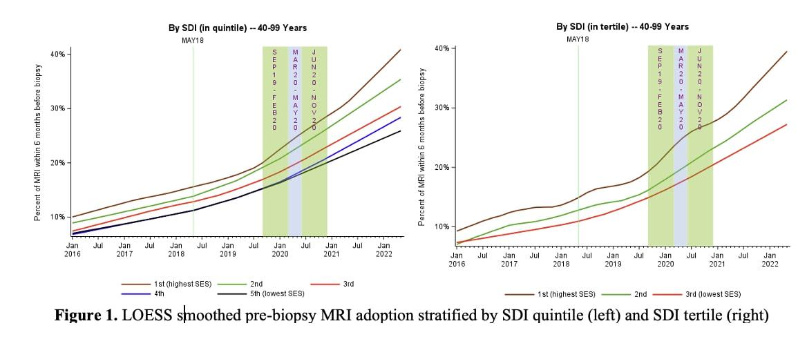 RESULTS: Among 112,567 patients undergoing prostate biopsy from 2016 to 2022, the proportion receiving pre-biopsy MRI increased from 9.45% in early 2016 to 33.19% by mid-2022 (p-trend<.01). Utilization was highest among patients aged 70-99 (19.8% overall; 35.26% in 2022) and lowest among those under 50 (16.15% overall; 31.30% in 2022). MRI use varied significantly by geography and socioeconomic status. Patients in metropolitan areas had higher utilization (35.41% in 2022) compared to non-metropolitan areas (22.50%). MRI use also differed by Social Deprivation Index (SDI), with those in the least deprived areas having significantly higher rates (39.69% in 2022) than those in the most deprived areas (26.03%, p<0.01). States such as Massachusetts, California, and Michigan saw the greatest absolute increases in utilization. Despite growth, disparities in MRI adoption persist based on socioeconomic and geographic factors.
