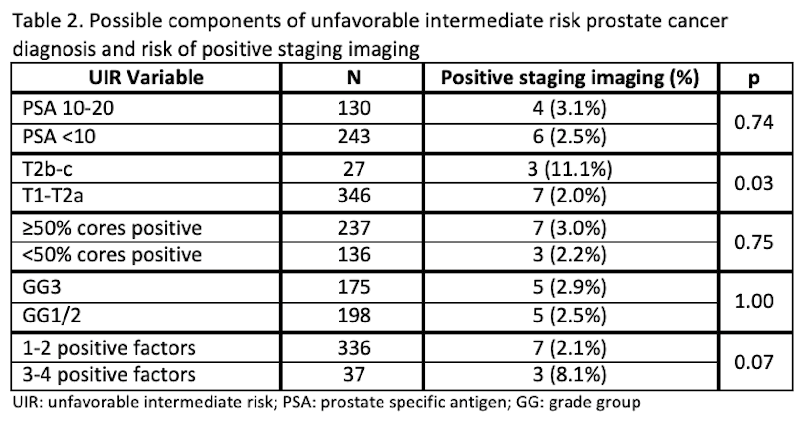 RESULTS: 397 patients were diagnosed with UIR PCa at our institution during the study period (Table 1). 373 patients (94%) had staging imaging performed, with positive or suspicious findings for regional or distant metastases in 0% of MRIs, 2% of CTs, 1% of bone scans, and 6% of PSMA PETs. Overall, advanced disease was identified in 10 patients (3%). Among individual UIR PCa diagnostic components, only T-stage (cT2b-c) was associated with positive staging imaging findings (Table 2).