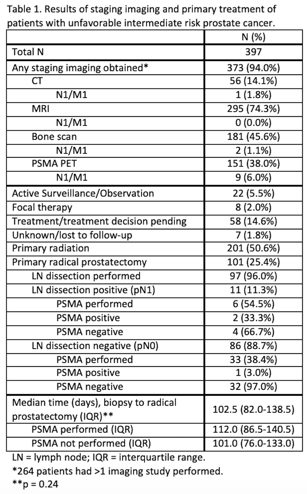 BACKGROUND: Since September, 2021, the NCCN Prostate Cancer Guidelines have recommended staging imaging for all patients diagnosed with unfavorable intermediate risk (UIR) prostate cancer (PCa). Conversely, the AUA/ASTRO guidelines recommend against staging imaging in asymptomatic patients with intermediate risk PCa. The value of universal staging imaging for UIR PCa has not been studied. We sought to determine the frequency and results of staging imaging in this population.