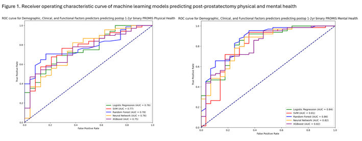 METHODS: We prospectively collected postoperative quality of life data using Patient-Reported Outcomes Measurement Information System (PROMIS) surveys from men undergoing prostatectomy at our institution (2015-2021), up to 3 years post-surgery. Outcomes were favorable PROMIS physical and mental health measures at 1-3 years post-operation. We collected demographic and clinical data from chart review, and preoperative functional status from the EPIC-26 and PROMIS questionnaire. We built prediction models using logistic regression, neural networks, support vector machines, XGBoost, and random forest, sequentially adding variable categories. Model performance and feature importance were assessed.
