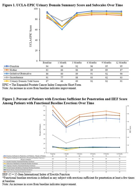 Results: The urinary domain score of the UCLA-EPIC questionnaire showed a mean of 87 at baseline and improved 12-month score of 91 (Figure 1). UCLA-EPIC function, bother, irritative/obstructive, and incontinence subscales also showed mean score improvements from baseline to 12 months post-procedure (Figure 1). Among patients (81%) with functional baseline erections, 72% retained erections sufficient for penetration at 12 months (Figure 2). All subscales of the IIEF-15 questionnaire approached baseline scores at 12 months (Figure 2).