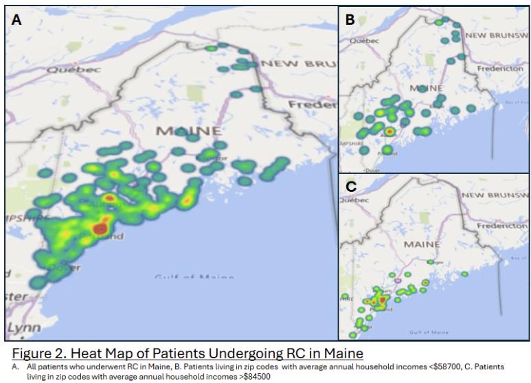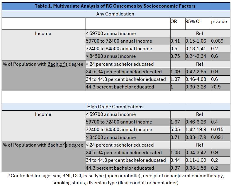METHODS: We analyzed 331 RC patients (2015-2024) using a prospectively maintained database with complete 90 day follow up. SES was estimated from 2020 census data using average annual income and the percentage of bachelor’s degree holders within a patient’s ZIP code. Multivariable logistic regression assessed complications, readmissions, 90-day mortality, and length of stay.