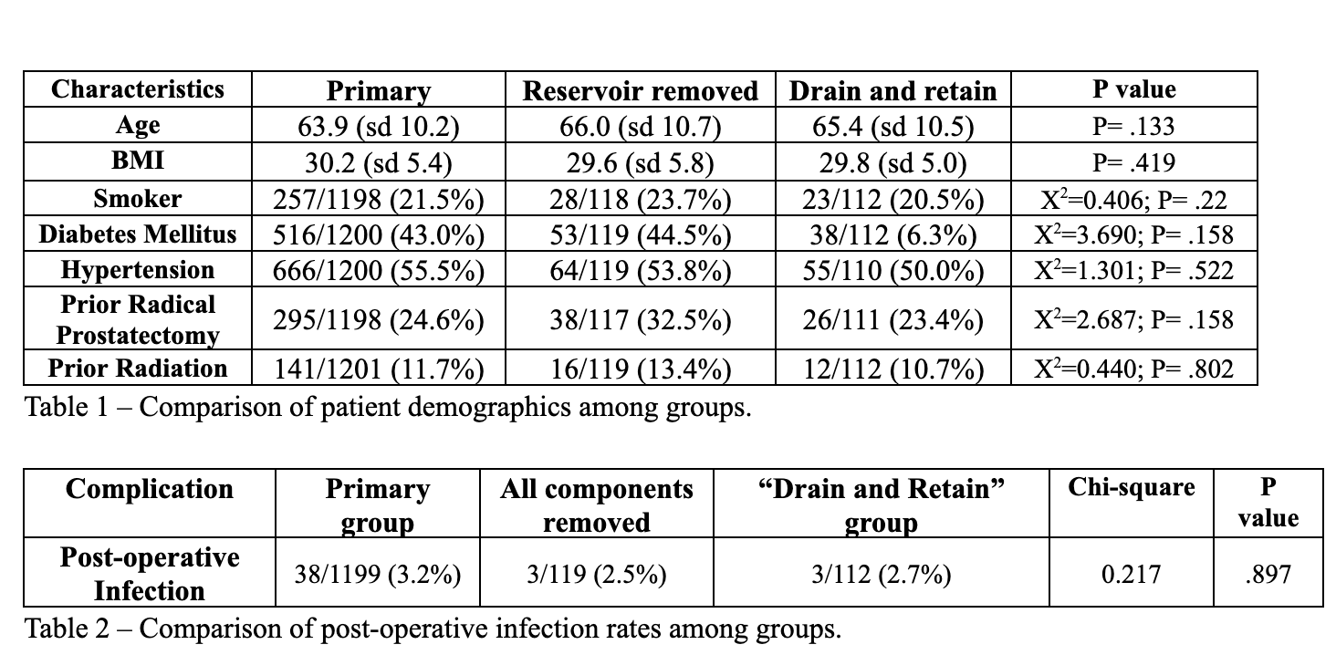 METHODS:Patients who underwent inflatable penile prosthesis (IPP) surgery at seven high volume centers in the United States between July 2016 and June 2024 were reviewed. We compared patients who underwent revision IPP surgery and subtotal device removal with “drain and retain” to those who had complete component removal and exchange. Explant cases for infection and revision cases using the original UPR were excluded. Postoperative infection rates were compared to patients receiving primary IPP surgery as a control group.