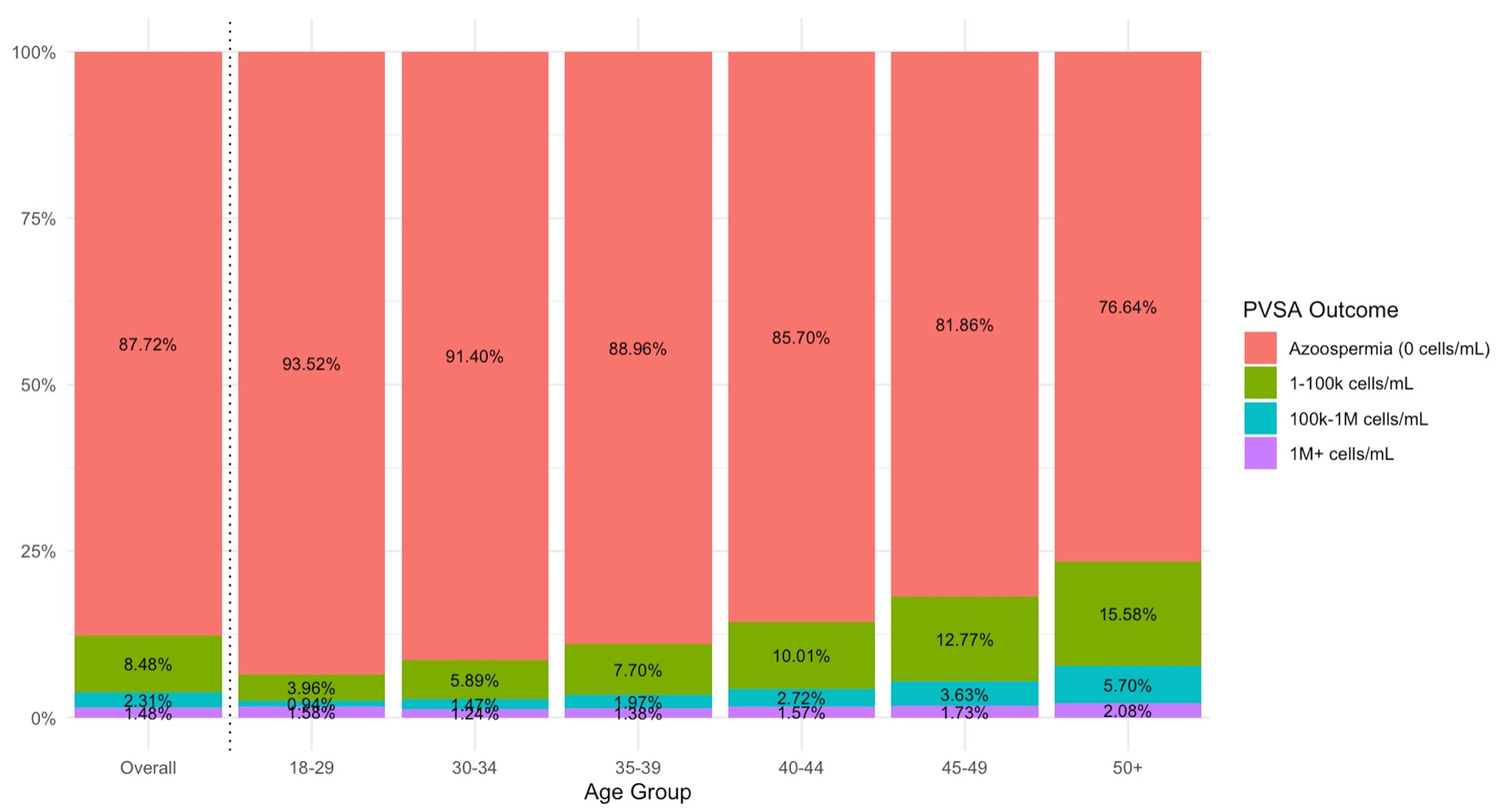 Conlusion: Older age is negatively correlated with PVSA clearance even after adjustment for ejaculation frequency and WT. The effect is most notable in men older than 50, where 23% have a non-azoospermia result. Greater than 10 PVE is correlated with improved vasectomy clearance.