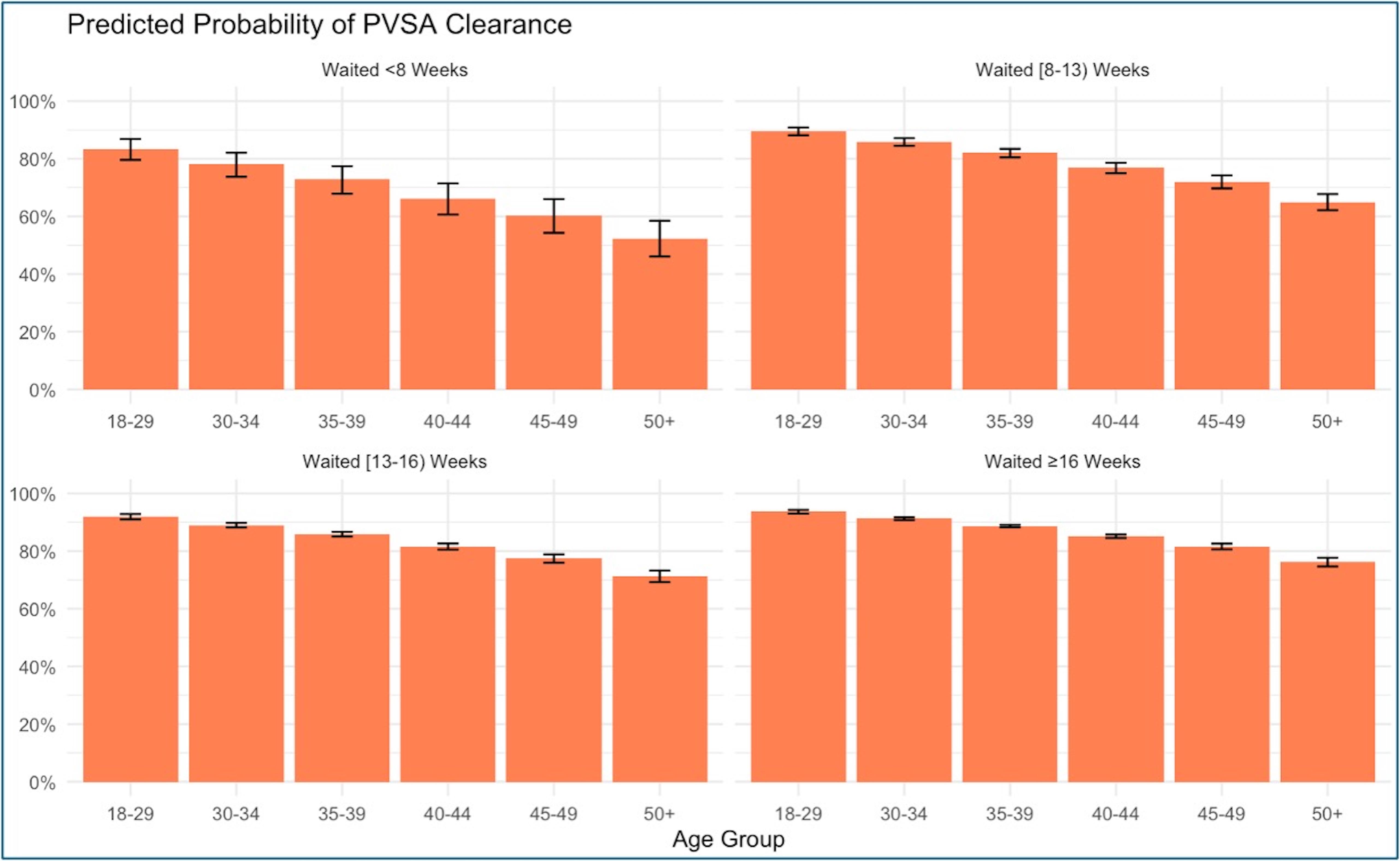 Methods: This IRB-approved, prospective cohort study followed men (n=79,826) in the USA who had a vasectomy between April 2021 and February 2025 and had subsequent testing with the Fellow Health post-vasectomy semen analysis (PVSA) system. The relationship between age, number of post-vasectomy ejaculations (PVE), waiting time (WT, weeks) from vasectomy and PVSA outcome (i.e. azoospermia “clearance”) was analyzed at first PVSA. A multivariable logistic regression model was constructed to assess the independent effects of these variables and the probability of clearance.