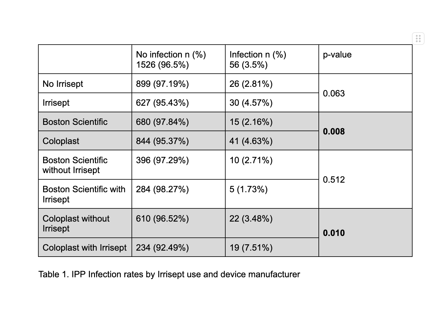 IPP Infection Rates with 0.05% Chlorhexidine Gluconate (Irrisept®) Differ by Device Manufacturer: Initial Results from a Large Multi-Institutional Cohort