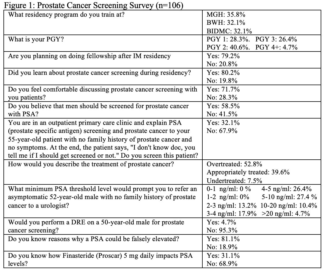 BACKGROUND: Prostate cancer (PCa) screening has undergone notable changes over the past decade, including the changes in United States Preventative Services Task Force’s recommendations and multiple randomized controlled trials showing varying utility in PCa screening. These varying recommendations have changed practice habits of internal medicine (IM) doctors. The goal of this study is to determine the opinion, and therefore likely future practice habits of current IM residents on PCa screening.