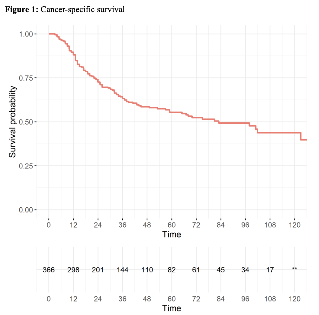 RESULTS: A total of 367 patients were included. Median age was 78 years (IQR 73-82). Tumor stage was T2 in 321 (87%). Median follow-up was 27.0 months. At 5-years, bladder-intact survival was 49%, CSS was 55%, and OS was 36% (Figure 1). On univariable analysis, female gender (HR 1.61) and Black race (HR 2.14) were associated with increased risk of CSM, while higher zip code income (unit HR 0.35 per $100,000) and higher education level were associated with lower risk of CSM. On multivariable analysis, female gender (HR 1.47) was associated with increased risk of CSM, while higher education level (HR 0.41 for <14% without high school education versus >29%) was associated with reduced CSM.