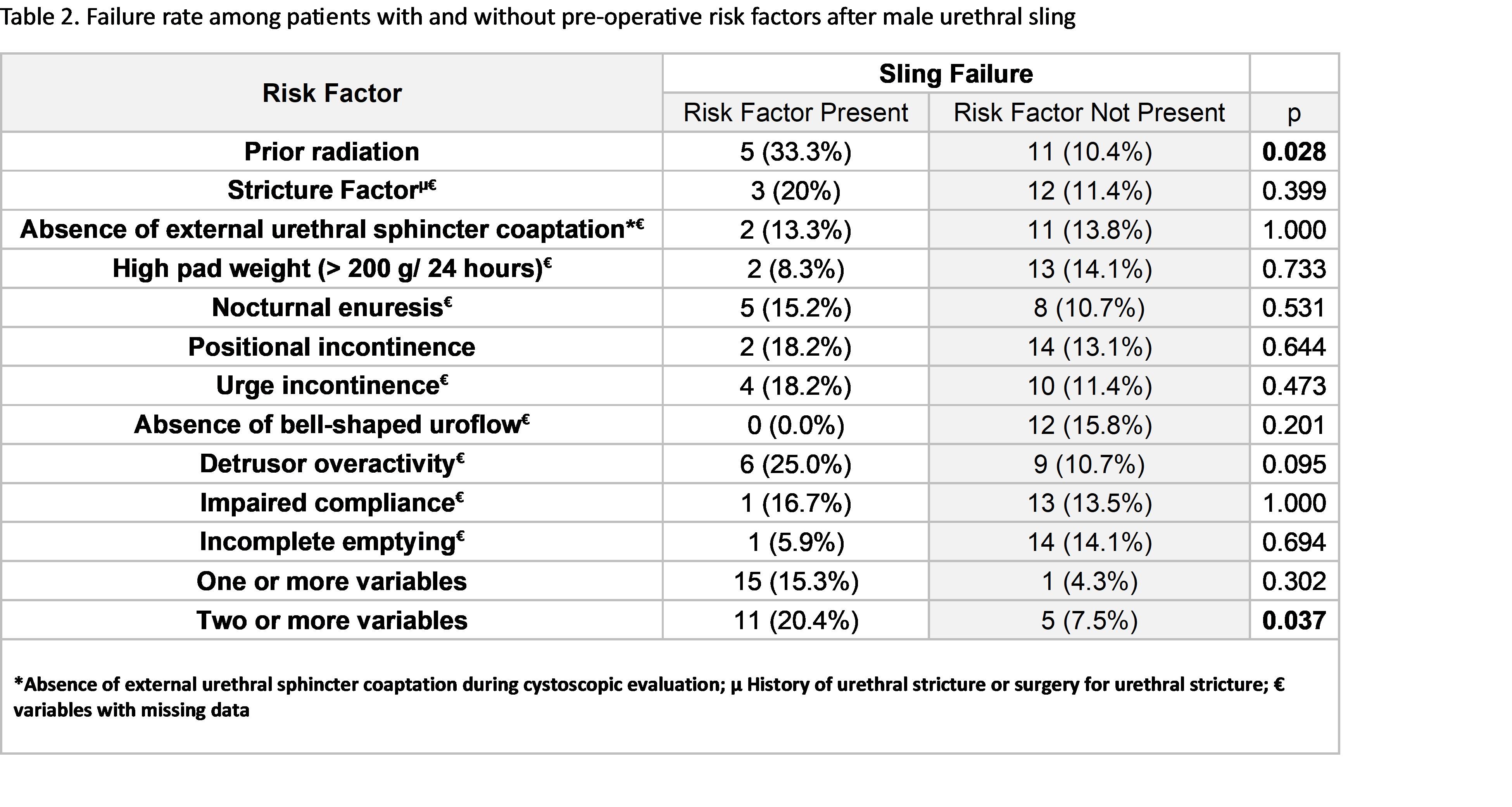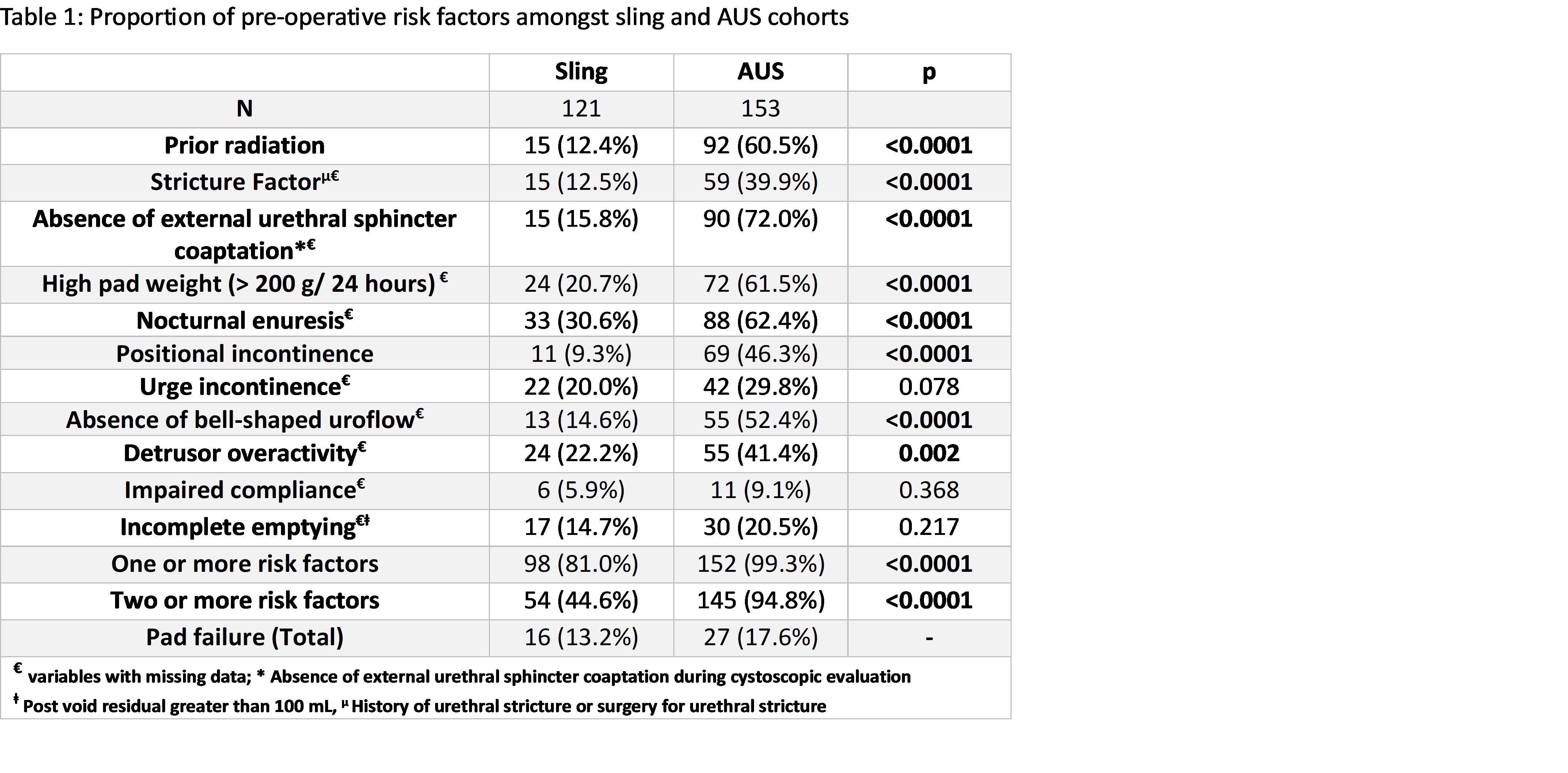 BACKGROUND: Though treatment success for stress incontinence is historically higher using an artificial urinary sphincter (AUS), patients prefer the male sling (MS). Studies have sought to identify pre-operative risk factors (RF) that increase sling failure. We incorporated 11 RF into our preoperative selection process, expecting that their use would produce continence outcomes comparable to the AUS. To test the utility of this selection process, we analyzed the incidence of RFs and pad failure for men in each group.