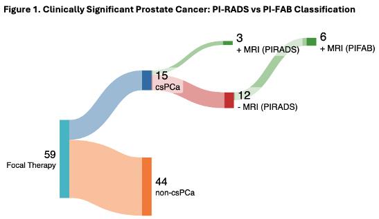 RESULTS: Of the 59 patients, 15 patients (25.4%) had csPCa at one year biopsy post-FT. Among those, PI-RADS identified csPCa only in 3 of 15 cases (20%). When applying PI-FAB, 9 of 15 (60%) csPCa patients were accurately identified (Figure 1). PI-FAB demonstrated a higher sensitivity compared to PI-RADS (60% vs 20%), indicating that PI-FAB is more effective in identifying patients with csPCa following focal therapy.
