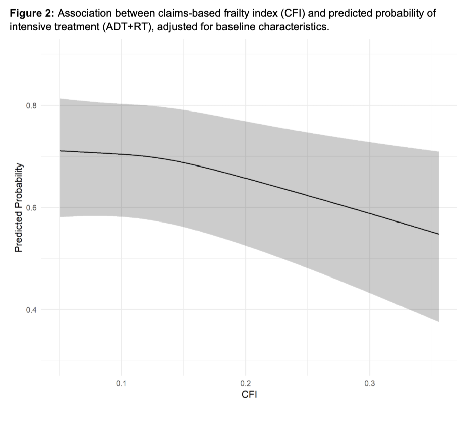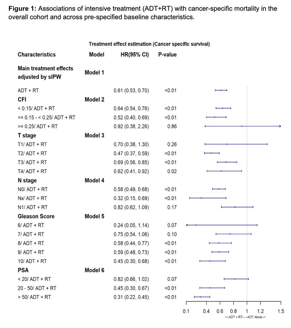 RESULTS: A total of 5,494 patients were included, including 3,378 treated with ADT+RT. Baseline characteristics were balanced after sIPW reweighting. Median follow-up was 64.0 months. ADT+RT was associated with improved cancer-specific (HR 0.61;p<0.01) and all-cause mortality (HR 0.84;p<0.01) in the overall cohort. Findings were consistent across CFI, T stage, N stage, Gleason score, and PSA (Figure 1). However, increasing frailty was associated with a reduced probability of receiving ADT+RT (adjusted OR 0.81 per unit CFI) (Figure 2).