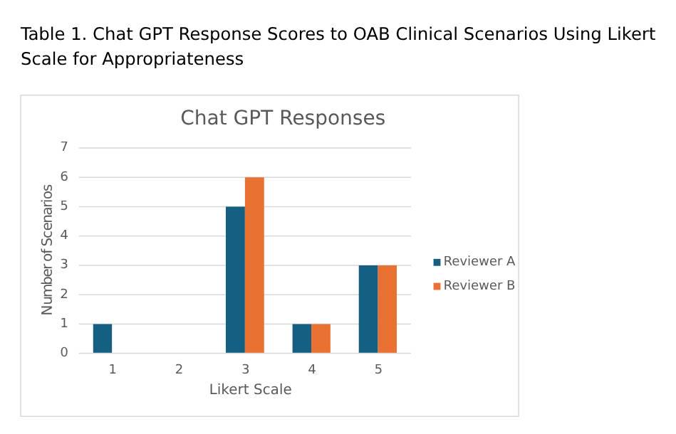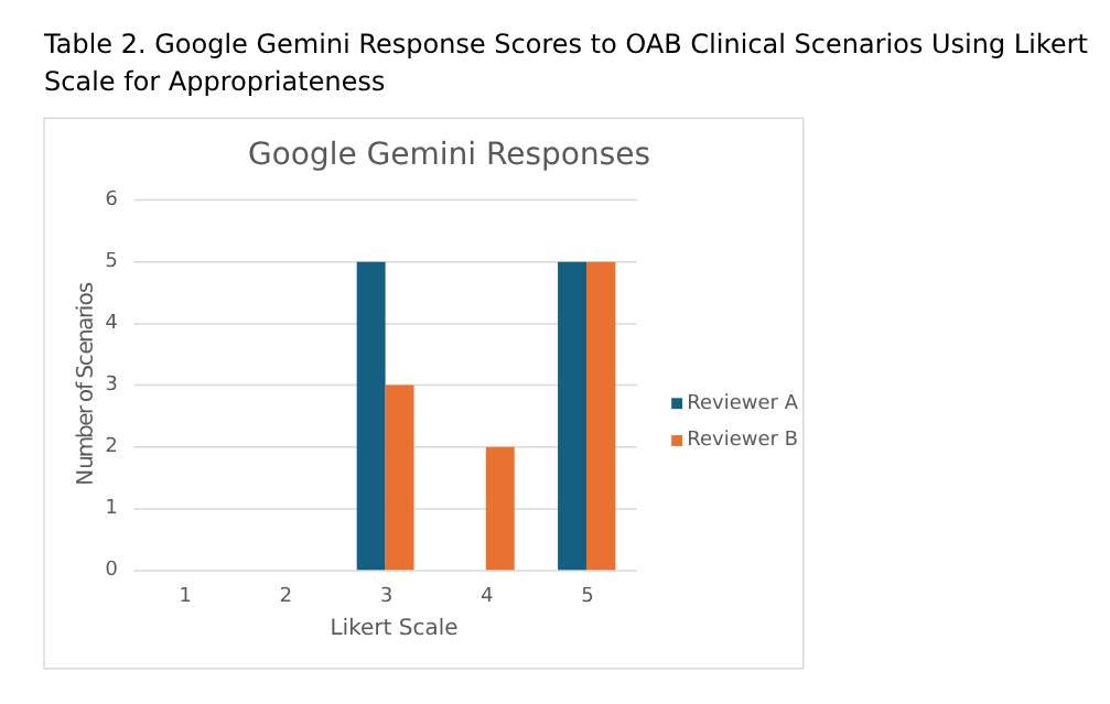 METHODS:A set of ten clinical scenarios encompassing OAB evaluation and management were used to query two LLM models- Chat GPT 4.0 and Google Gemini 2.0. Their responses were blinded and distributed to two independent fellowship-trained urogynecology and pelvic reconstructive surgery (URPS) urologists. A five-point Likert scale for appropriateness was used to assess concordance of LLM recommendations with current AUA/SUFU guidelines.