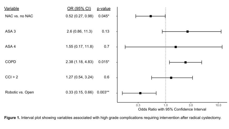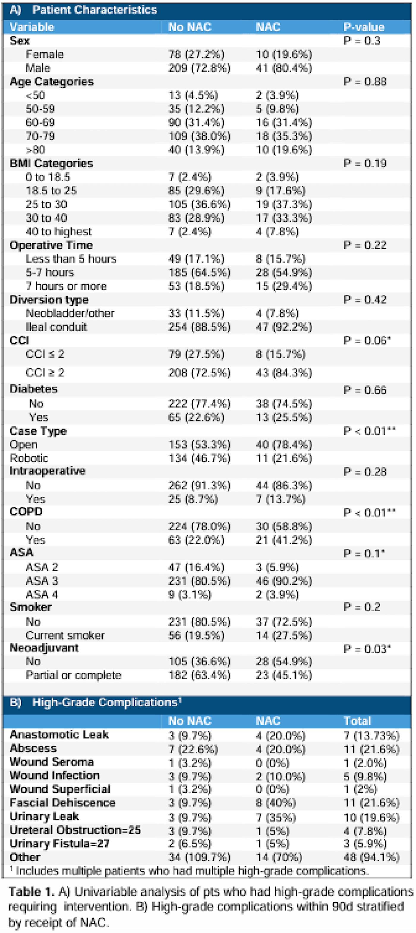 Among 338 RC pts, 205 (60.1%) received NAC. High-grade complications occurred in 20 NAC pts (9.8%). On univariable analysis, NAC, COPD, ASA score, open surgery, and CCI >2 were associated with complications (Table 1A). Multivariable analysis demonstrated that NAC was independently associated with lower odds of complications (OR 0.52, 95% CI 0.27-0.98, p=0.045, Figure 1). The most common were abscess (21.6%), fascial dehiscence (21.6%), and urinary leak (19.6%) (Table 1B). Fascial dehiscence, anastomotic leak, and urinary leak occurred more frequently in the NAC group, though not all differences reached significance. CONCLUSIONS: