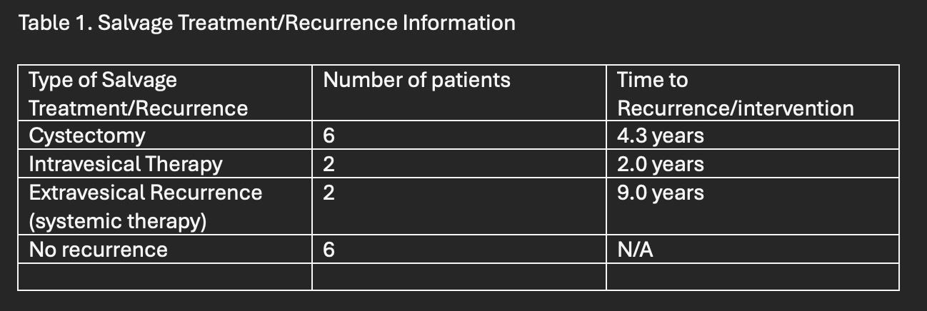 RESULTS: A total of 16 patients were identified as having a CR. Median follow-up was 7.3 years and median age at time of diagnosis was 64 years (61.2-69.5). 94% of NAC regimens were platinum based. 5 year overall and recurrence free survival from MIBC diagnosis were 94% and 76%. 4 (25%) patients were alive at 10 years. Of note 2 patients developed extravesical metastatic disease (15.7%) with a time to metastatic recurrence of 9.0 years (8-10). A total of 8 patients (50%) developed intravesical recurrence with 6 requiring cystectomy (37.5%) and 2 requiring intravesical therapy (12.5%). Mean time to cystectomy was 4.3 years (2-8). 6 (37.5%) patients did not have a recurrence.