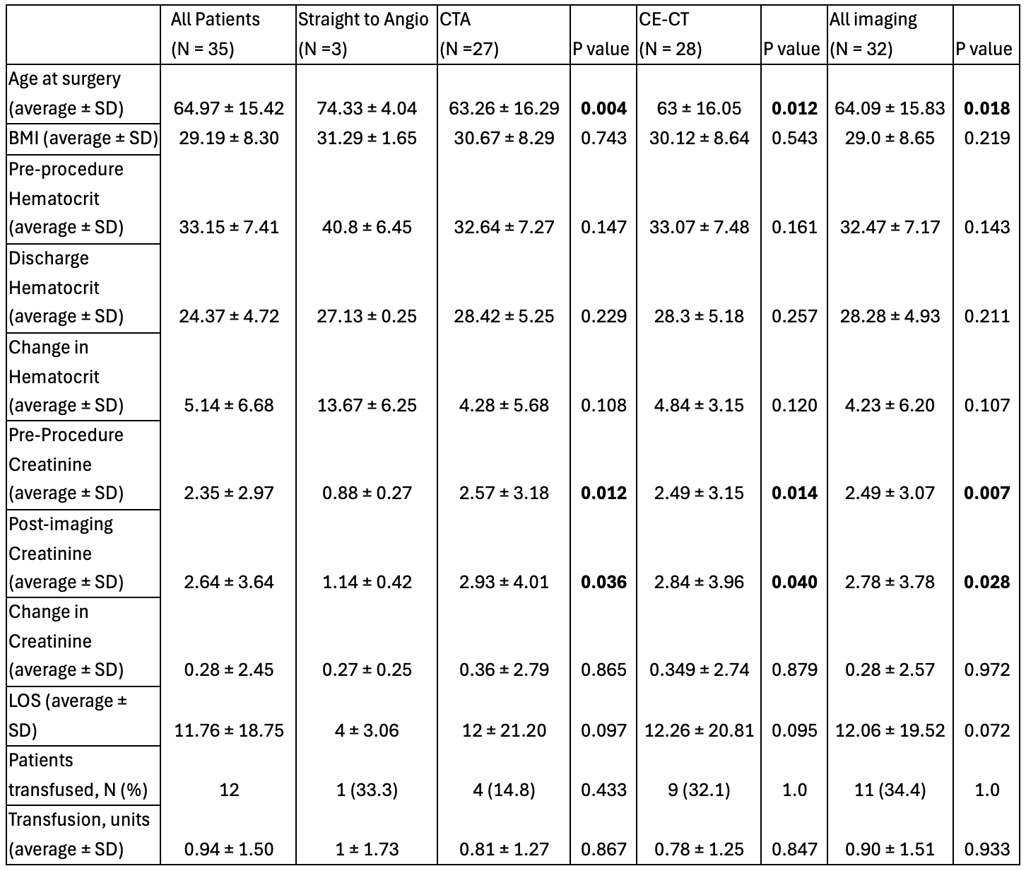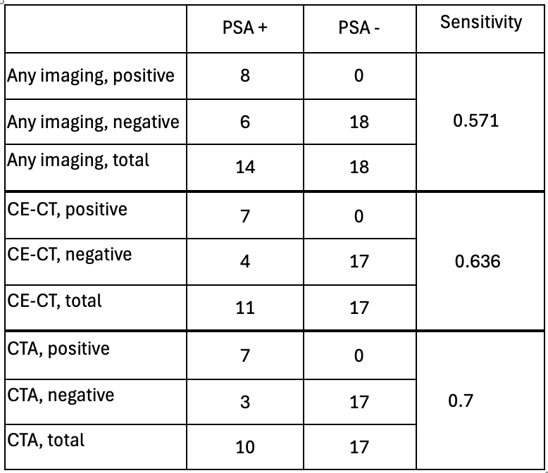 Methods:After IRB approval, we reviewed patients with suspected post-procedure rPSA from 2015-2024. Procedures included percutaneous nephrolithotripsy (PCNL), nephrostomy tube placement, renal biopsy, and cryoablation. rPSA suspicion was based on hematuria, hematocrit drop, or perinephric hematoma. Data on demographics, imaging type, pre/post-procedure hematocrit and creatinine, length of stay, and blood transfusions were collected. Statistical analysis included t-tests, ANOVA, and Fisher’s Exact test. Imaging sensitivity was compared using DSA as the reference.