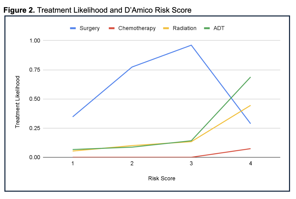 RESULTS: Analysis included 1,195 patients. PCa incidence was higher in lower ADI strata and decreased in higher strata (Figure 1). Treatment approaches were consistent across ADI levels. Treatment was associated with disease severity (Gleason and D’Amico scores) rather than socioeconomic status (Figure 2). A greater proportion of high-risk patients (D’Amico score 4) were found in higher ADI strata. Regression analysis showed a significant association between higher ADI and more severe disease (e.g., ADI 9 coefficient = 0.635, p < 0.05), with ADI 5 and 9 patients more likely to present with Gleason grade group 4-5 tumors.