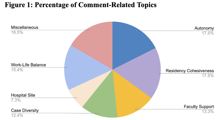 RESULTS: Analysis of 895 comments across seven topics showed significant topic distribution (χ˛ = 186.4, p < 0.001). Autonomy and residency cohesiveness were the most frequently mentioned topics, each making up 17.5% of impressions over the three cycles. Work-life balance was next at 15.4%, while miscellaneous topics, including VA rotations and research opportunities, accounted for 16.5%. Faculty support (13.3%) and case diversity (12.4%) were also notable topics. Hospital sites had the fewest mentions (7.3%). Figure 1 illustrates impression topic breakdown.