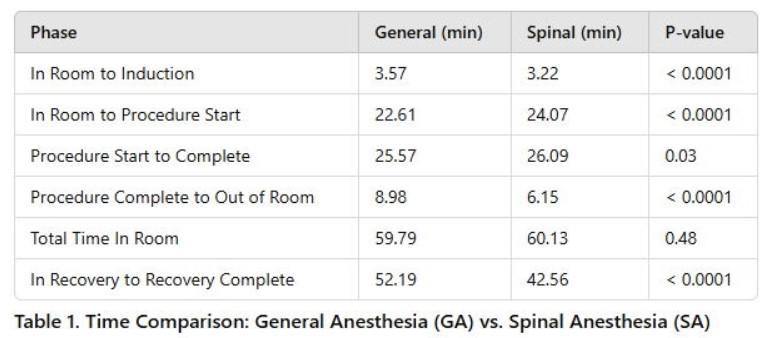 RESULTS: We analyzed 889 patients (482 GA, 407 SA). Total operating room (OR) time did not differ significantly (p = 0.48). SA required slightly more OR time pre-procedure (+1.46 min, p<0.0001) but reduced post-procedure time (-2.83 min, p<0.0001). Recovery time was significantly shorter with SA (-9.63 min, p<0.0001) (Table 1). While SA supply costs were 10.8% lower (p = 0.015), total costs were similar (p = 0.08).